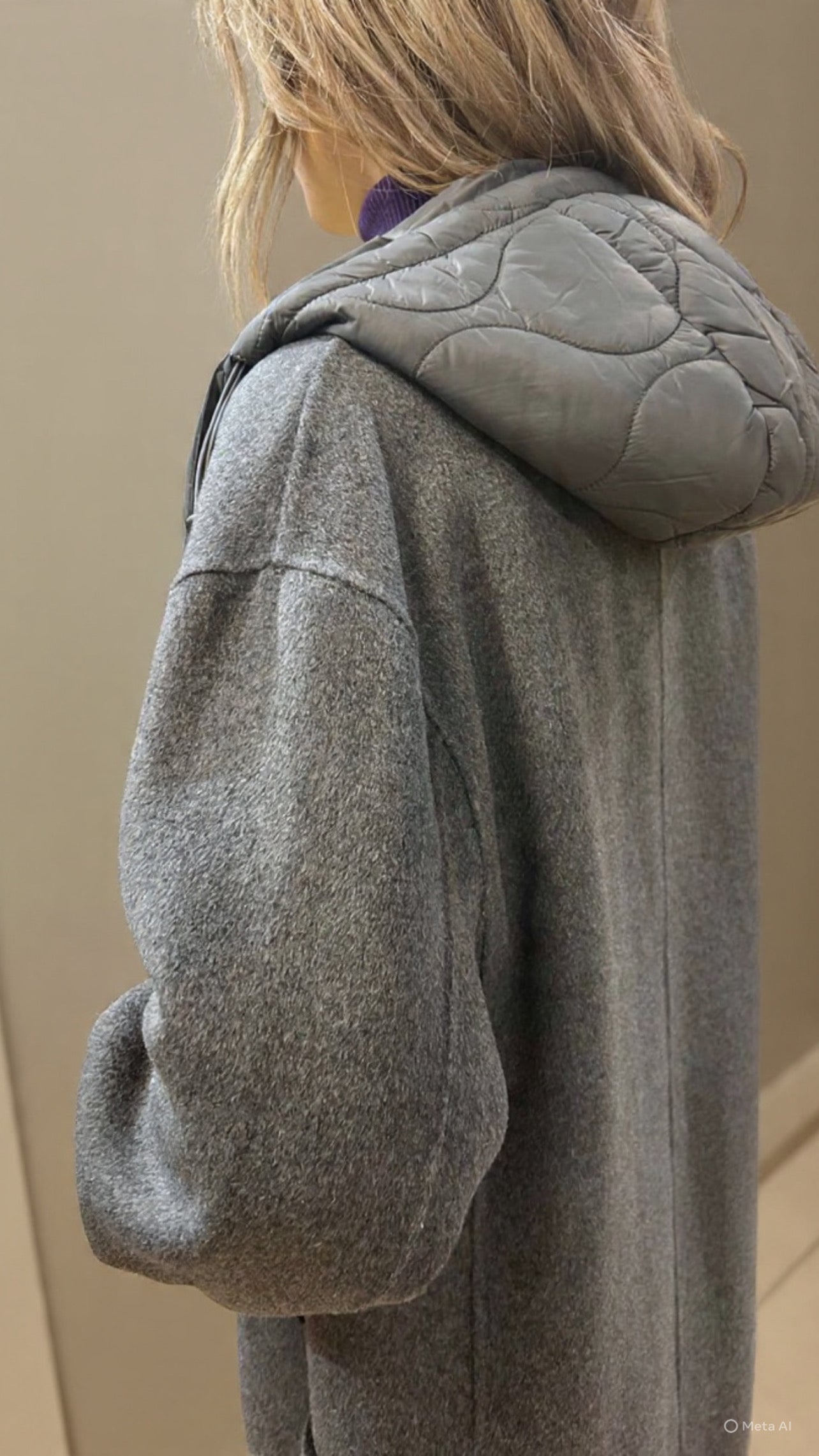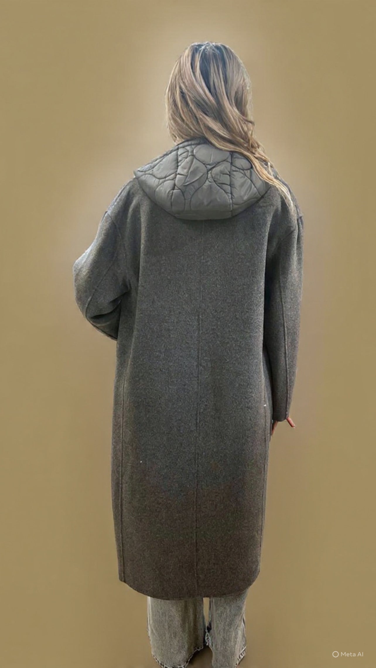 Cappotto lungo dal design pulito e contemporaneo, realizzato in tessuto effetto lana caldo e strutturato, ideale per affrontare la stagione con stile. Il taglio doppio petto dona eleganza al capo, mentre il cappuccio integrato aggiunge un tocco moderno e funzionale.