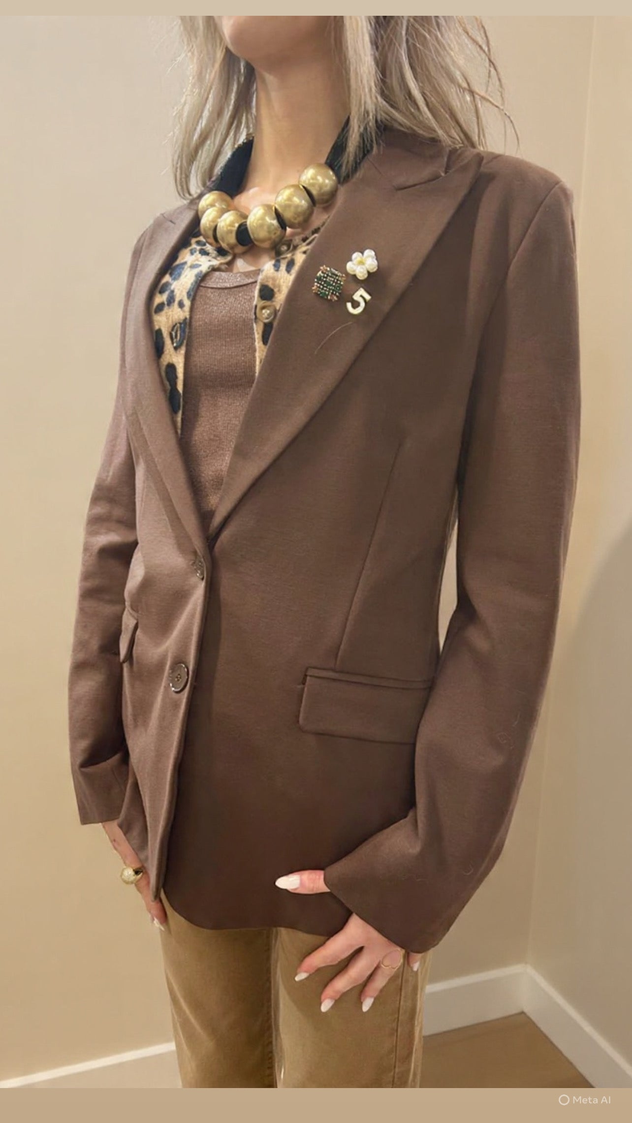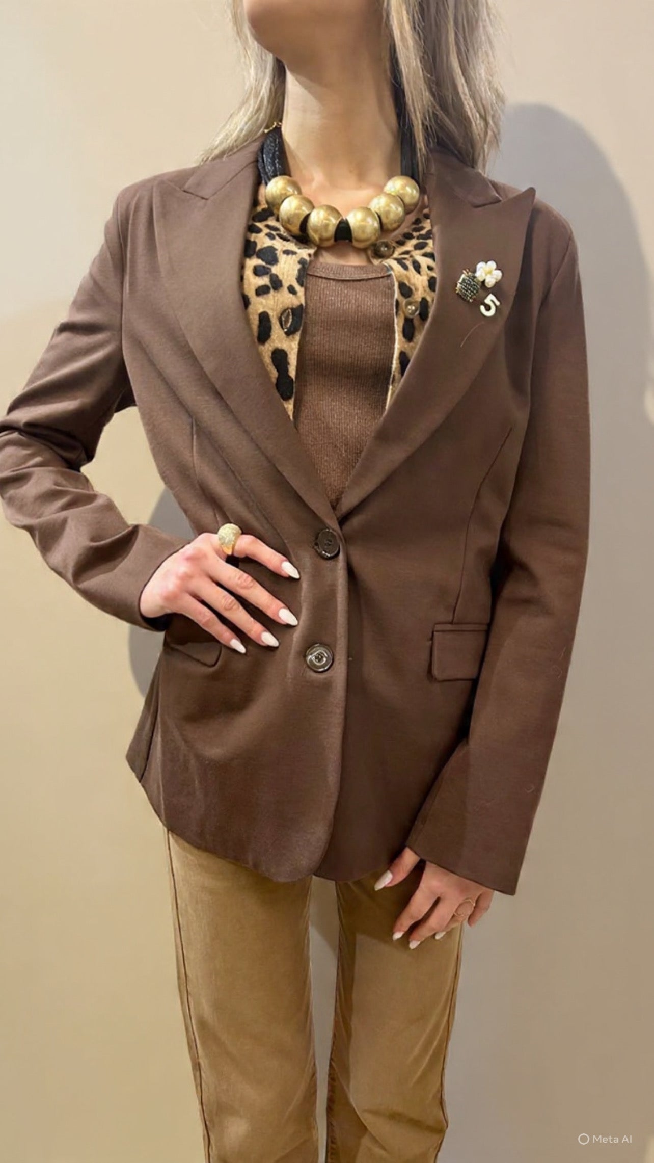Blazer dal taglio femminile ed elegante, realizzato in tessuto morbido e confortevole, perfetto per completare look quotidiani e outfit più curati. Il colore cioccolato, caldo e raffinato, lo rende un capo estremamente versatile e facile da abbinare.