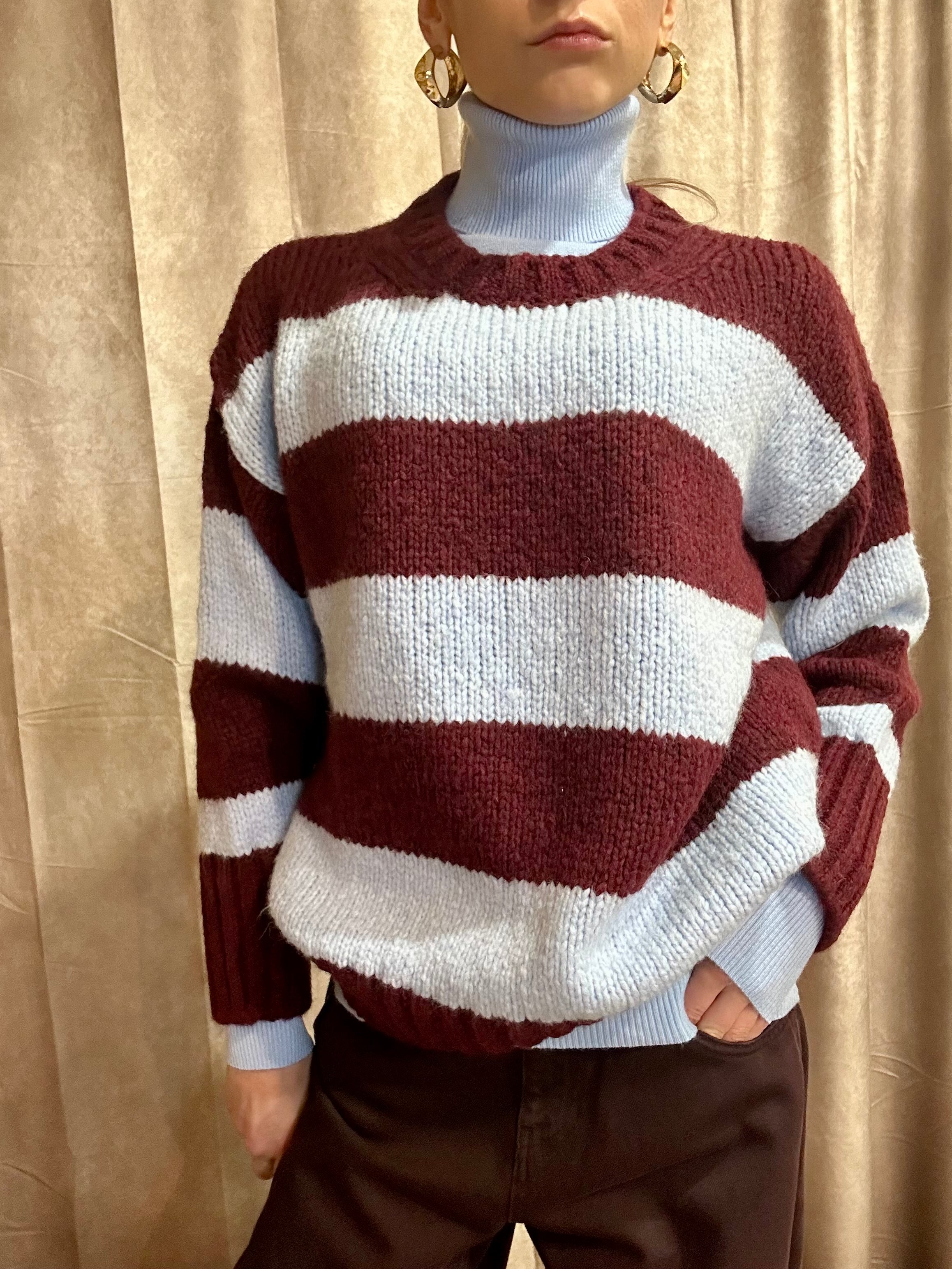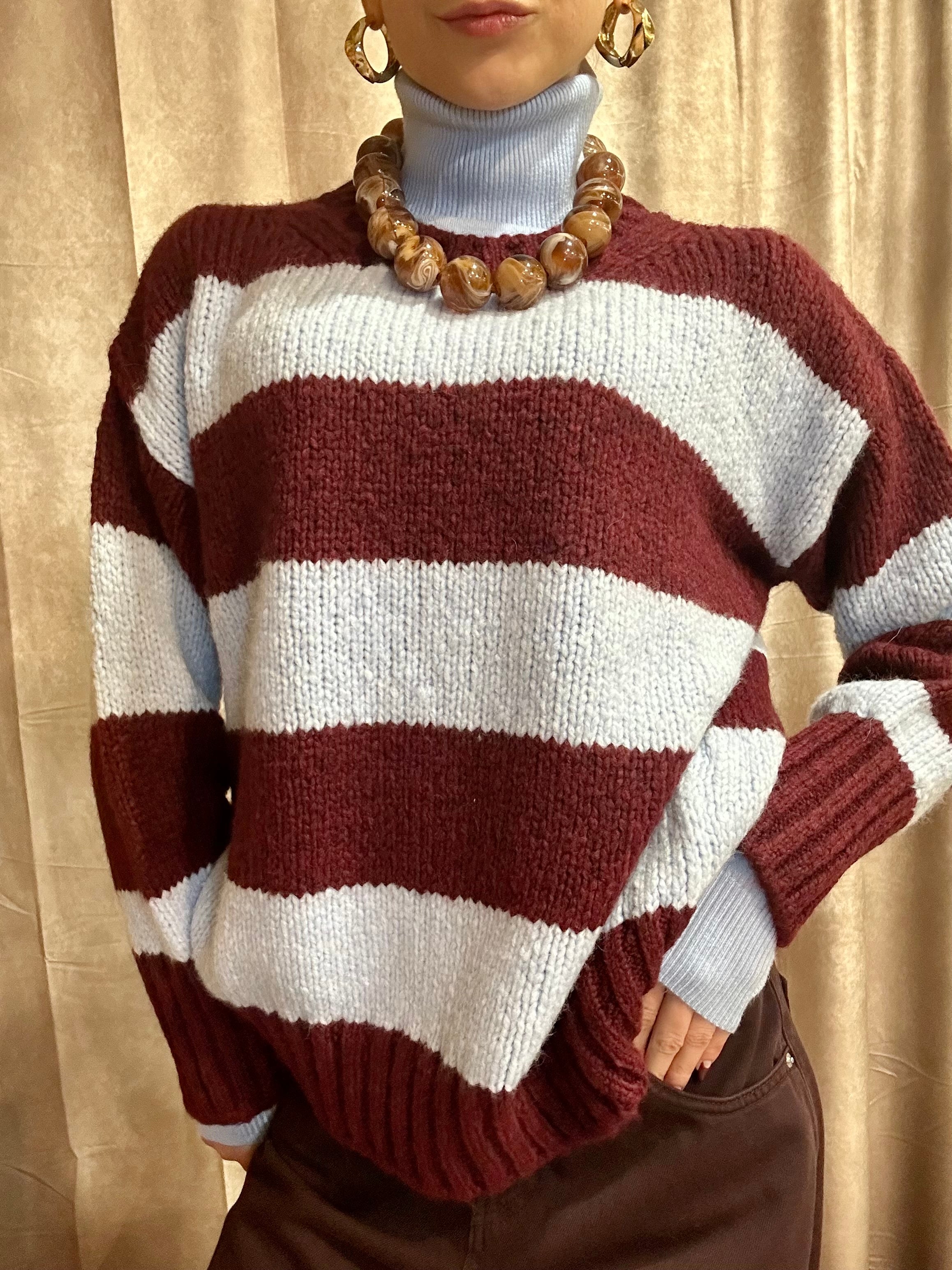Maglia in tricot morbido con maxi righe nei toni del bordeaux e dell’azzurro polvere. Un modello caldo, soffice e super confortevole, perfetto per la stagione. Lo stile casual-chic la rende ideale sia per look quotidiani che per outfit più ricercati.