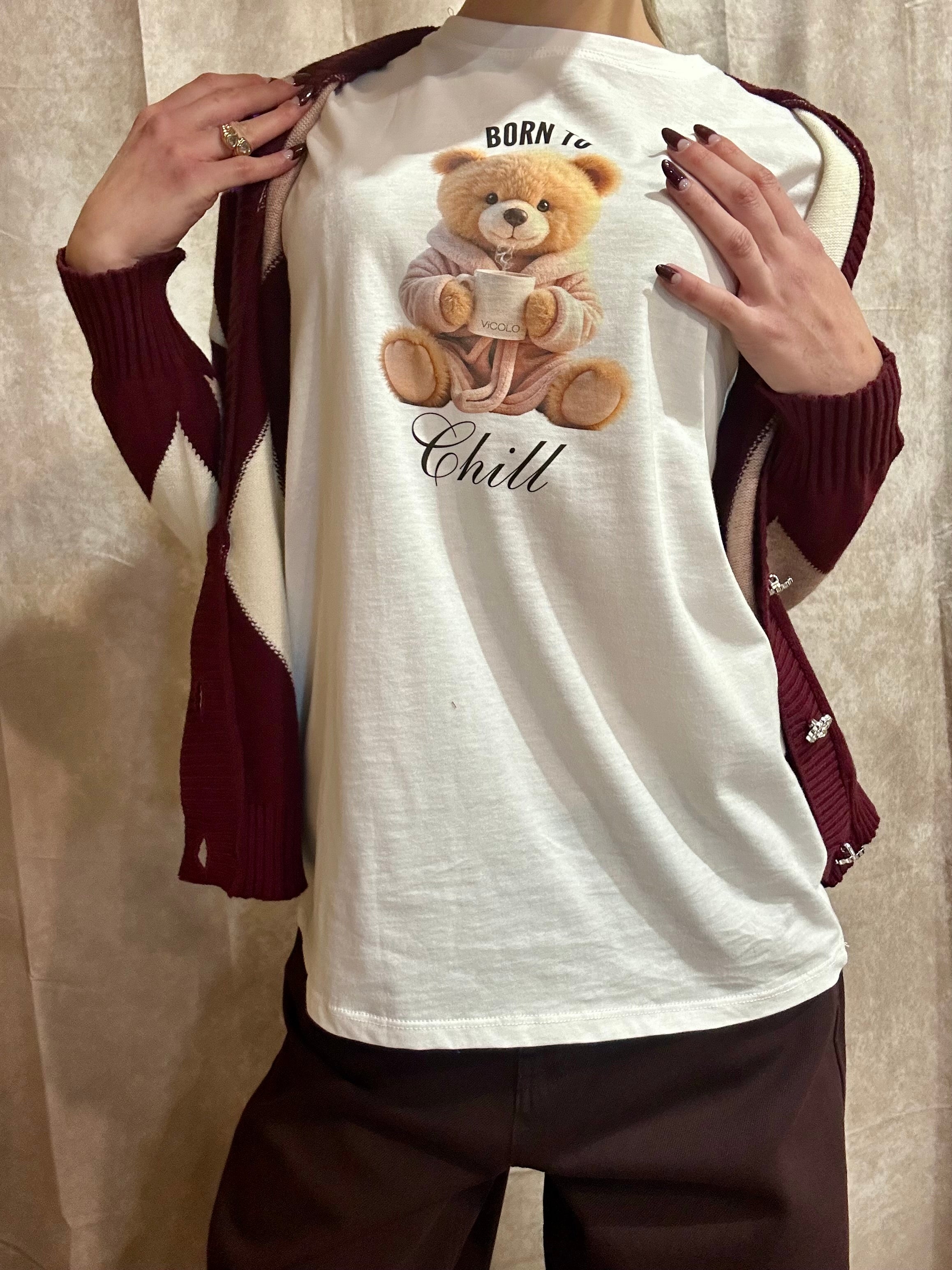 T-shirt in cotone bianco con adorabile stampa orsetto frontale e scritta “Born to Chill”. Un modello divertente e super versatile, perfetto da indossare sotto cardigan, blazer o felpe per aggiungere un tocco cute e contemporaneo al look.