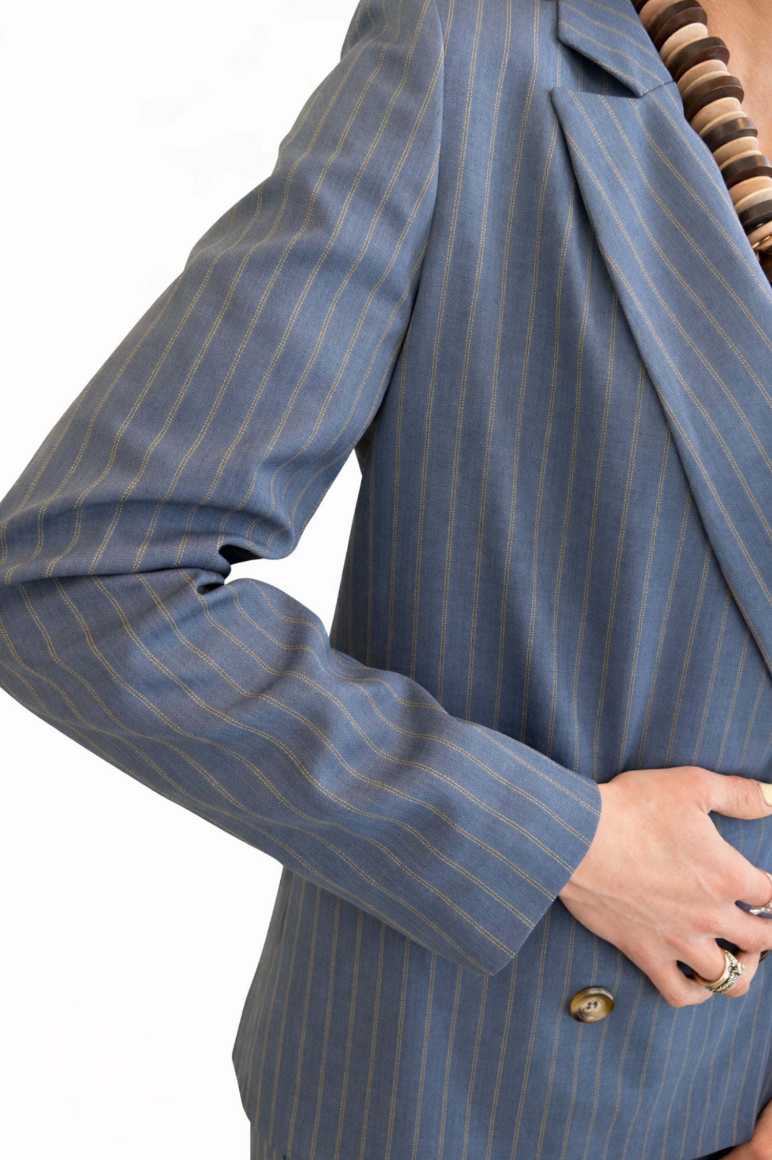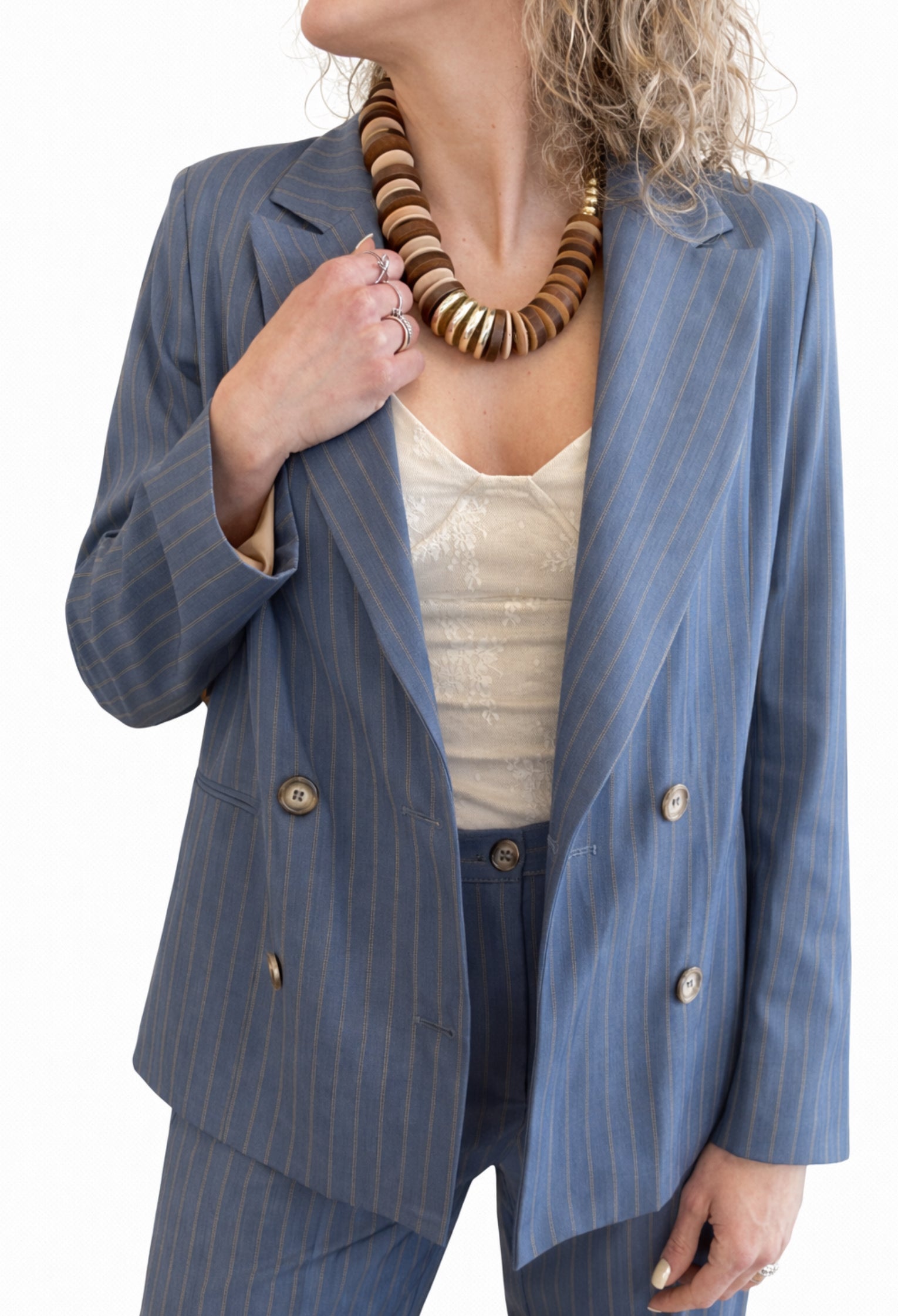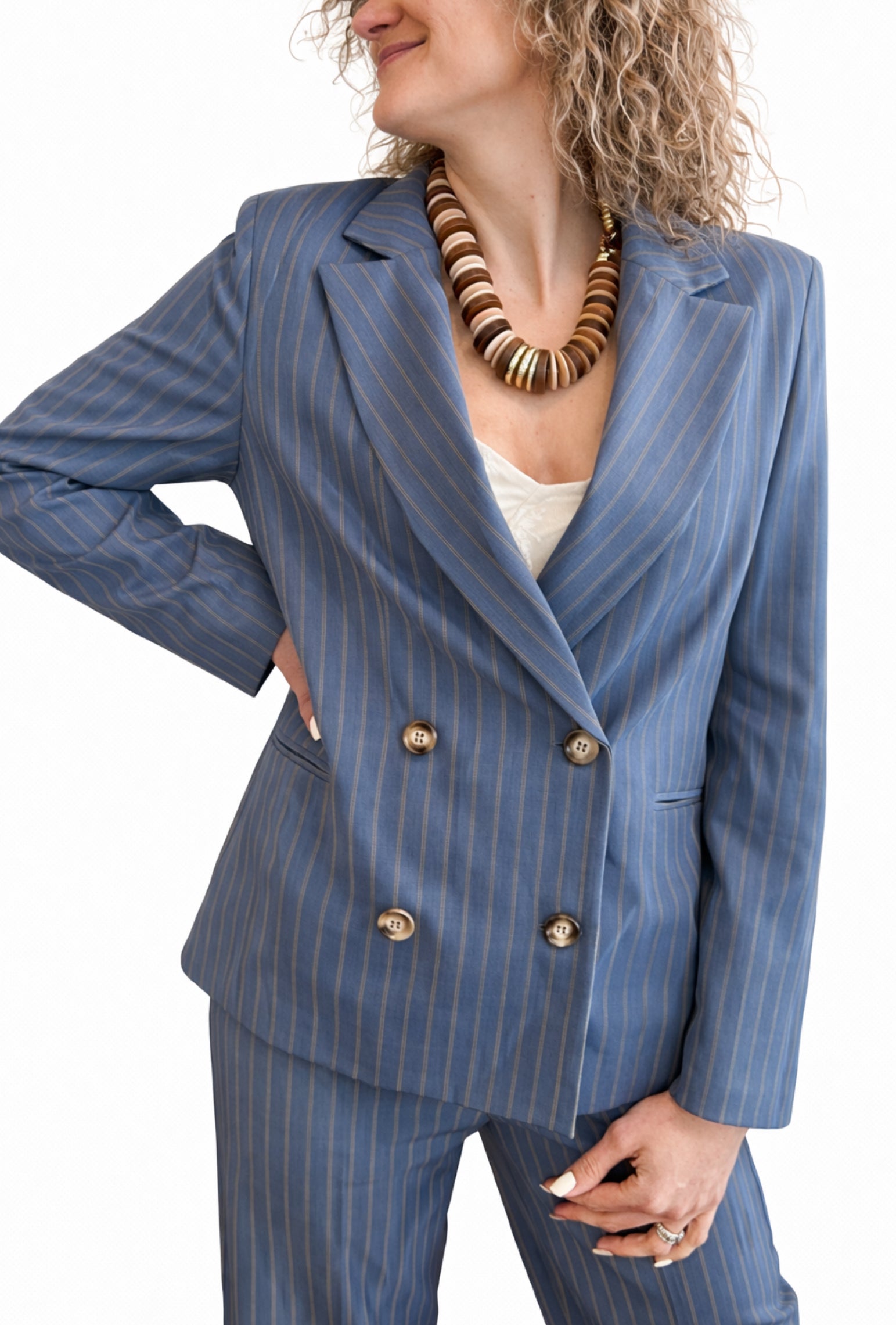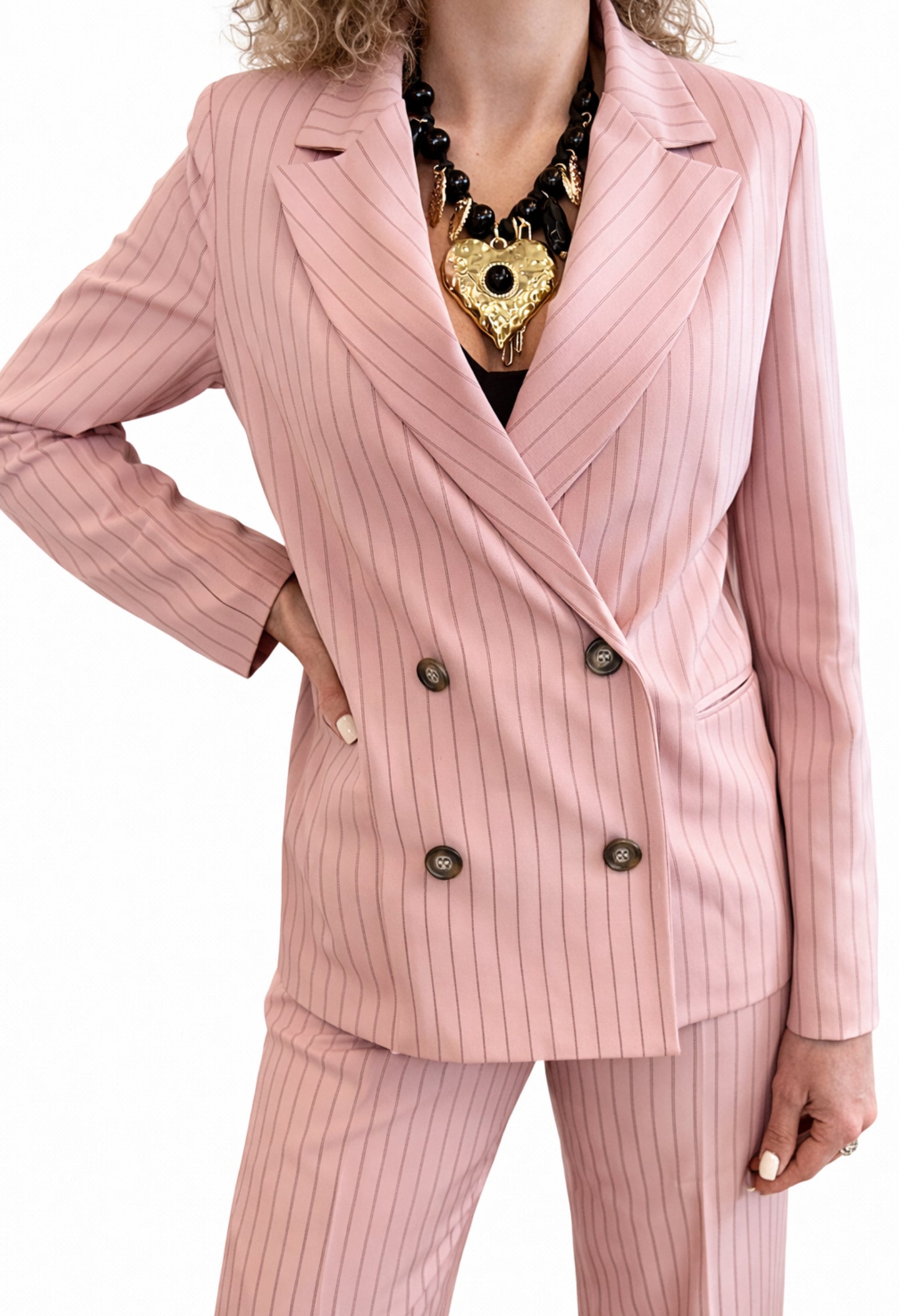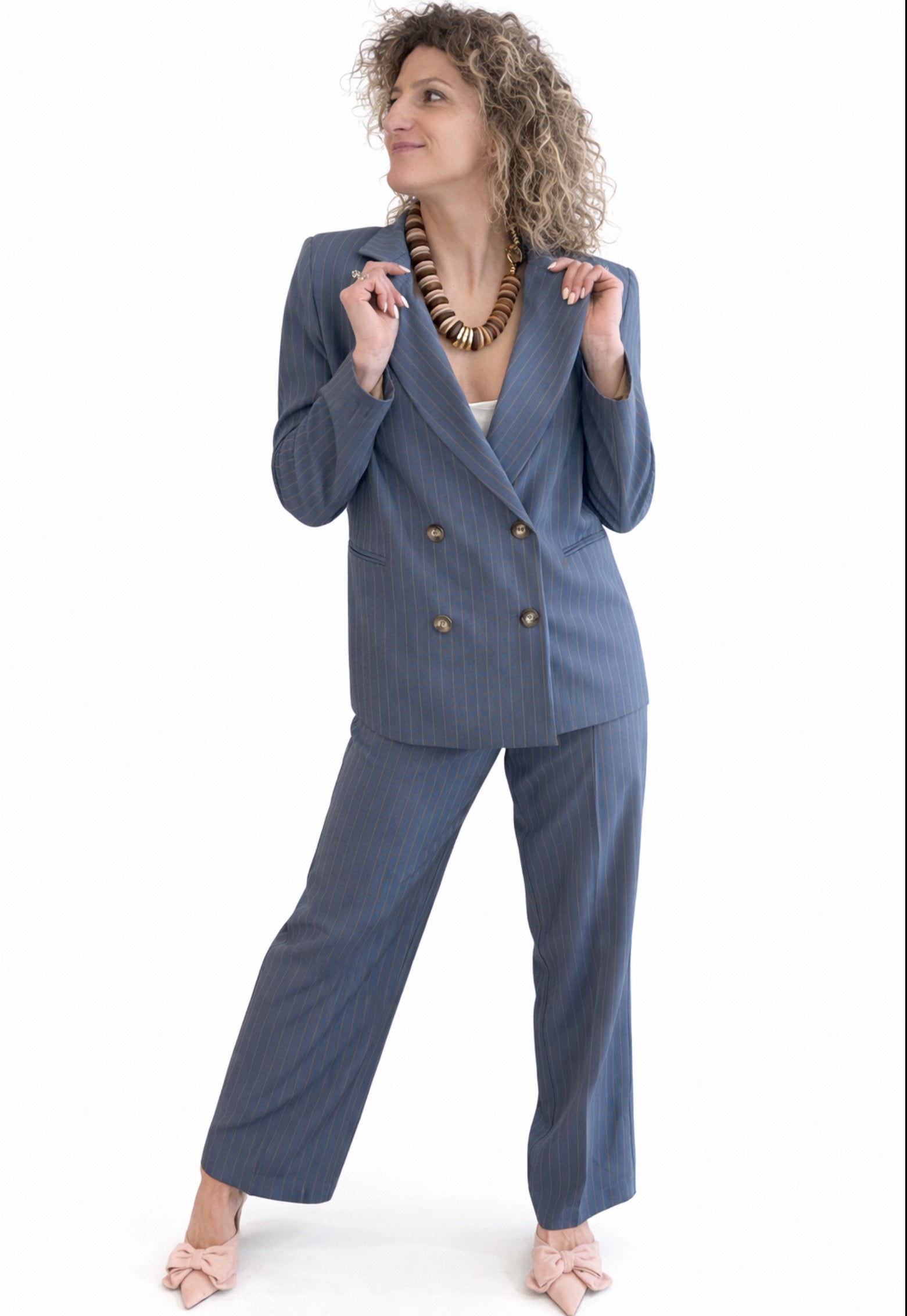 Un blazer elegante ma facile, che struttura il look senza appesantirlo. Il gessato sottile lo rende raffinato, mentre il taglio doppiopetto dà subito carattere.